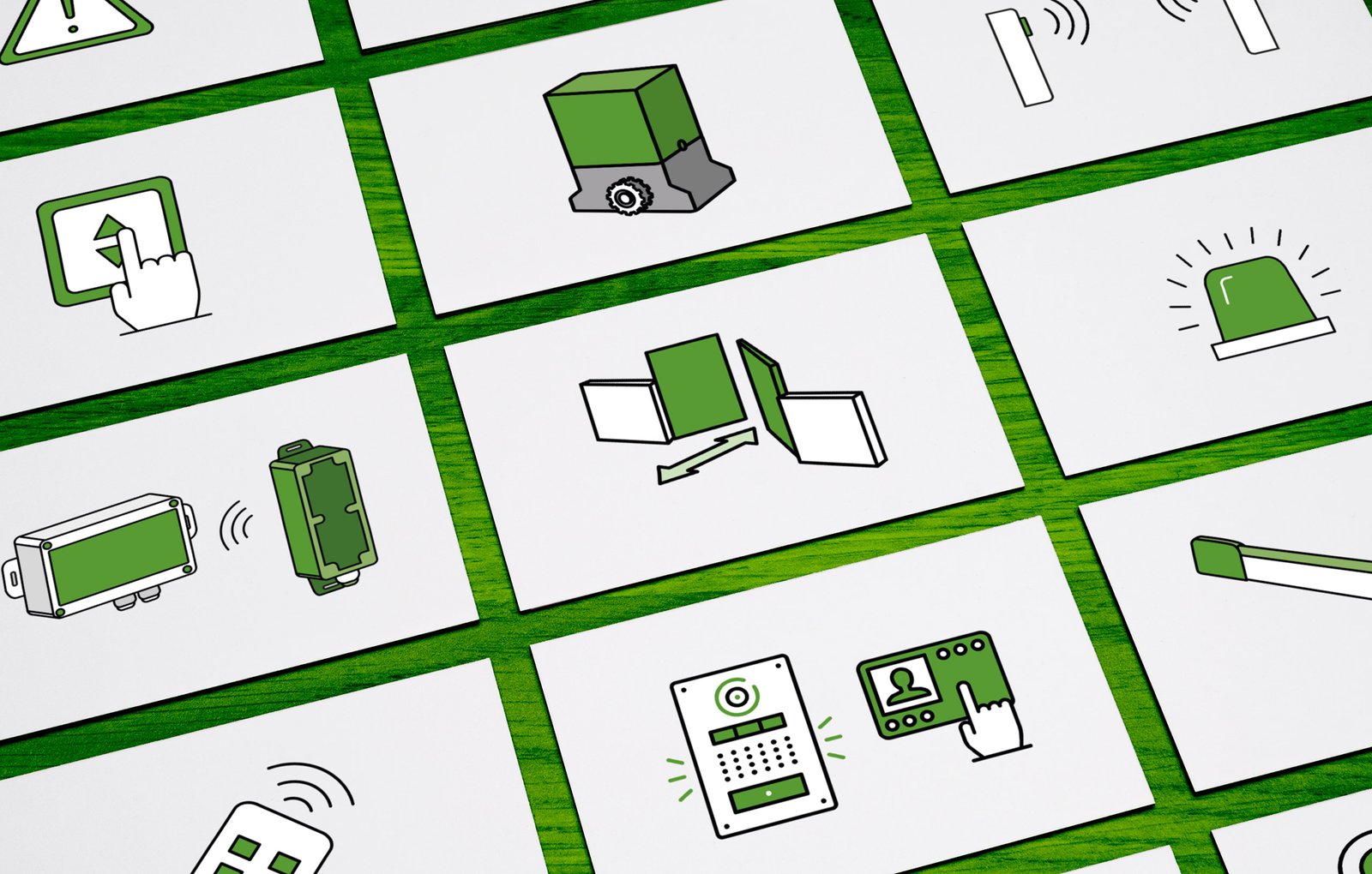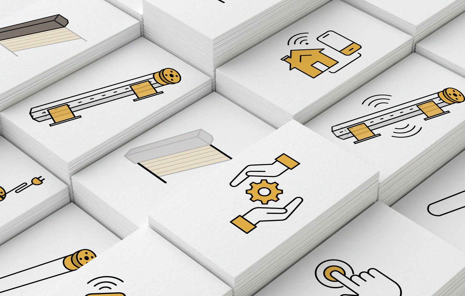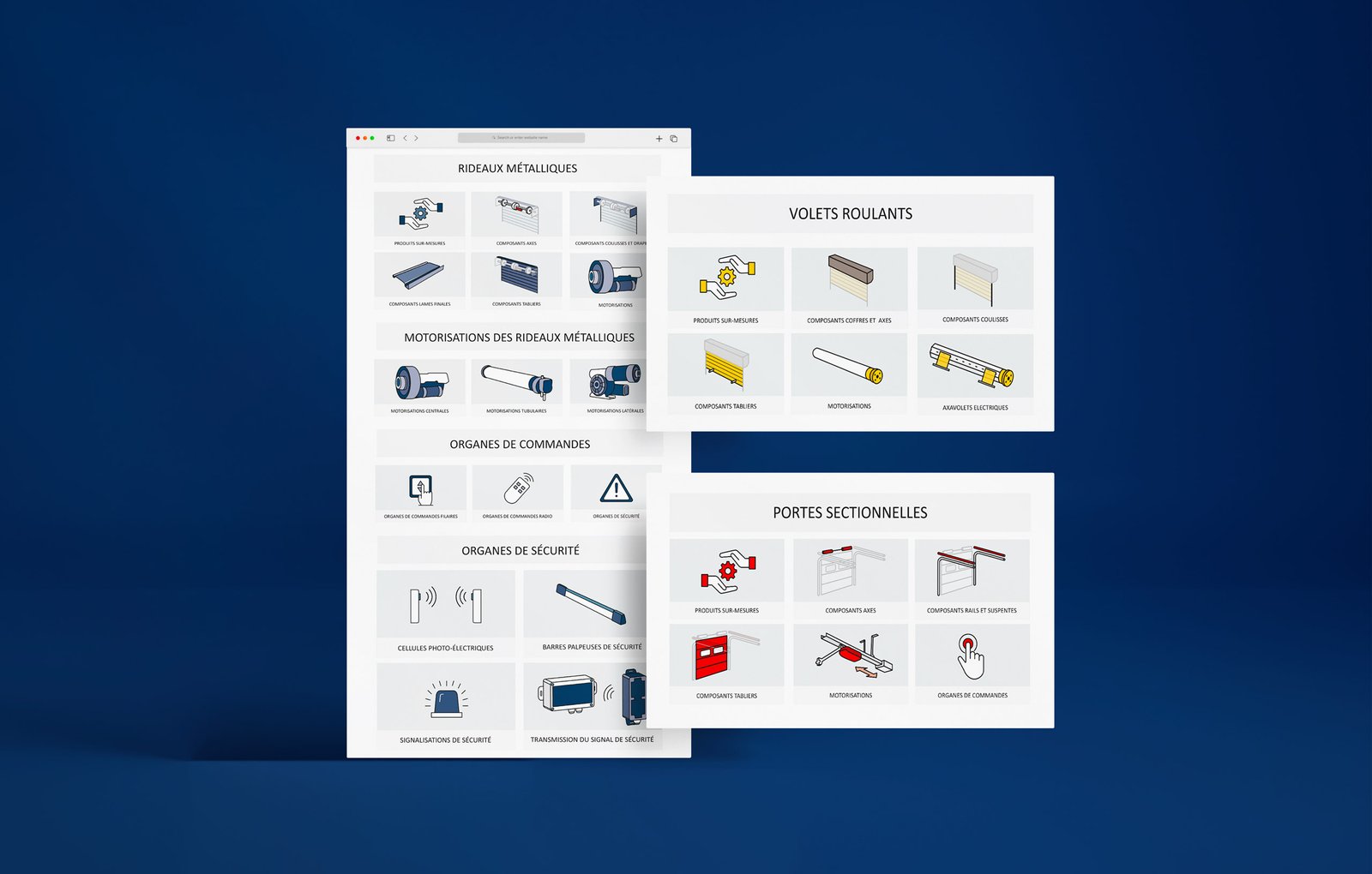Mes fermetures, client spécialisé dans la fabrication de volets roulants, rideaux métalliques et portes de garage, ainsi que dans la vente de pièces détachées pour les réparer (moteurs et accessoires), a souhaité que je créé des pictogrammes uniques afin que les produits ne soient rattachés à aucune marque ni à aucun fabricant.